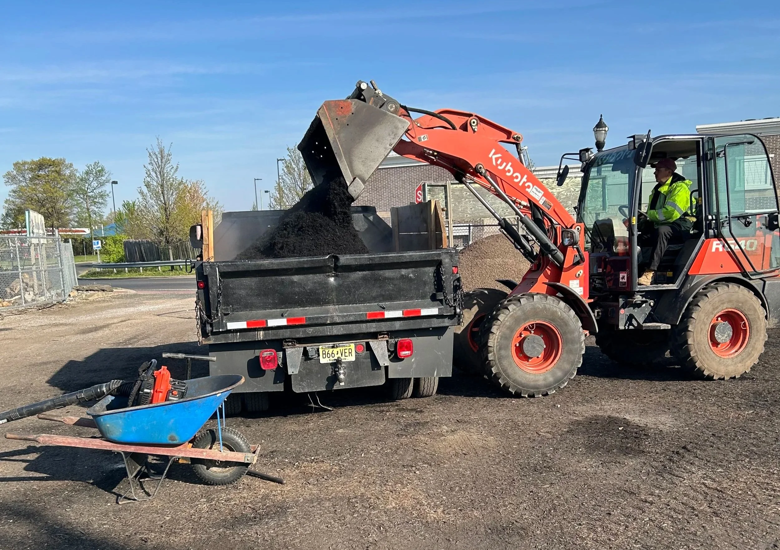 A person working on a landscaping project using a small dump truck filled with dirt, with trees and houses in the background on a sunny day.